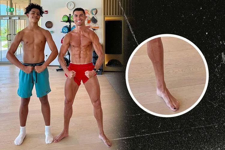 Cristiano Ronaldo dan sang anak tampak berpose dengan bertelanjang dada, sambil menunjukkan otot mereka.